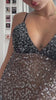 Blusa curta em paetês pretos com brilhos prateados. Possui decote em V e alças finas, com detalhe levemente transparente na região da barriga que adiciona um toque sensual e sofisticado.
