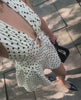 Vestido curto em tecido leve com estampa poá. Modelo frente única com decote profundo em V e costas nuas. Saia com leve volume para um caimento fluido.